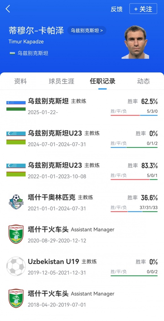 卡帕泽执教乌兹别克斯坦国家队战绩
