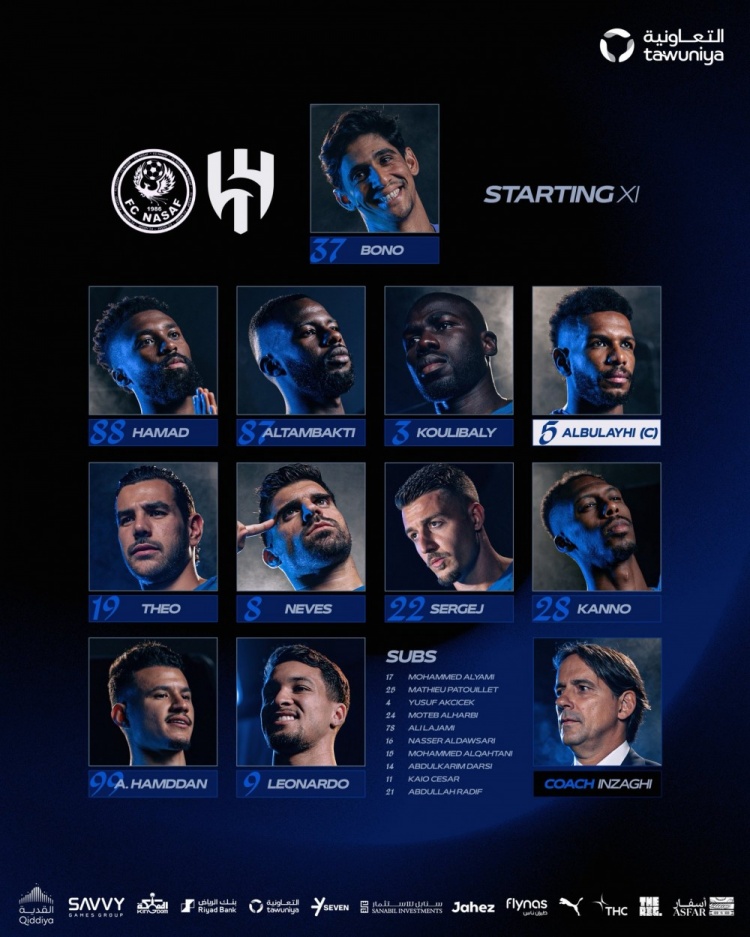 利雅得新月首发:37-布努、88-哈马德-亚米、87-坦巴蒂、3-库利巴利、5-布莱希、19-特奥、8-鲁本-内维斯、22-米林科维奇、28-卡努、99-哈姆丹、9-莱昂纳多